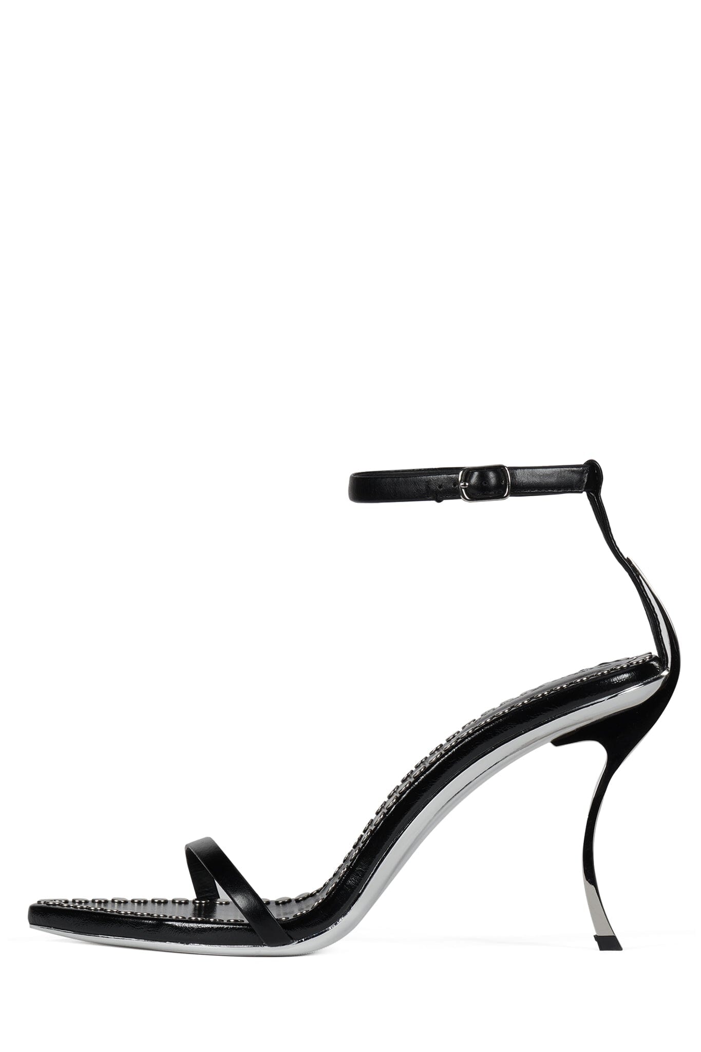 Pointed-toe minimal sandal with studded insole detail and metal sculpted heel